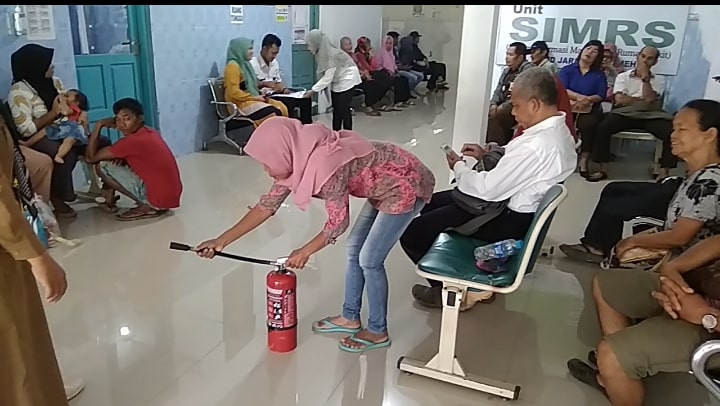 Petugas mempraktekkan cara penggunaan APAR dan memberikan kesempatan kepada pengunjung di Poliklinik RSUD Jaraga Sasameh untuk mempraktekkannya.