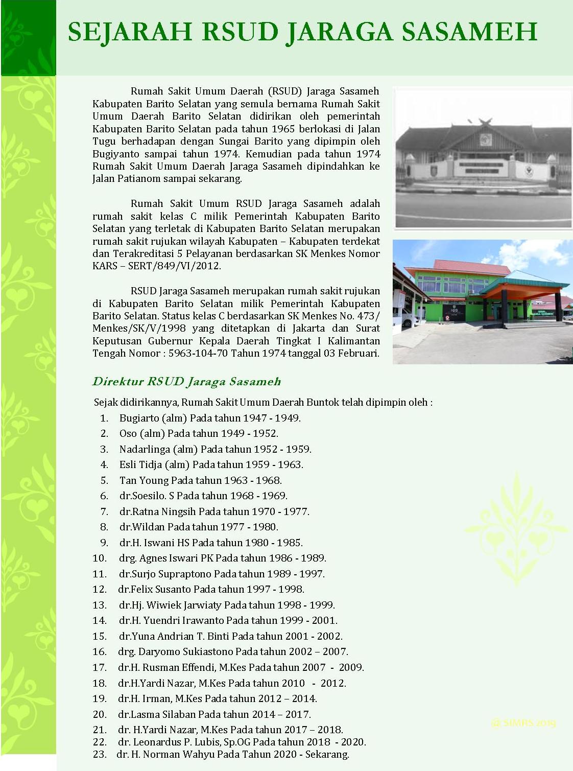 Selamat datang di Website Rumah Sakit Umum Daerah Jaraga Sasameh Kabupaten Barito Selatan. Website ini bertujuan untuk memberikan informasi tentang Rumah Sakit Umum Daerah Kabupaten Barito Selatan.